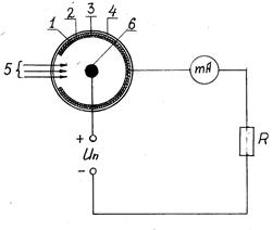 Рис. 6.1. Принципиальная схема фотоэлемента: 1-эмитирующий слой металла (катод); 2-пленка окисла; 3-зеркало; 4 – стеклянный баллон; 5 – световой луч; 6-анод.