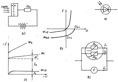 Рис.6.9 Фотодиод. а-принципиальная схема; б, г-вольт-амперная характеристика; в-обозначение на схеме; д-схема замещения.