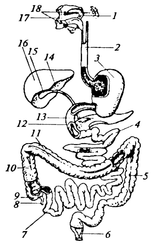 1 – глотка; 2 – пищевод; 3 – желудок; 4 – тонкая кишка; 5 – нисходящая часть толстой кишки; 6 – прямая кишка; 7 – подвздошная кишка; 8 – аппендикс; 9 – слепая кишка; 10 – восходящая часть толстой кишки; 11 – ободочная кишка; 12 – двенадцатиперстная кишка; 13 – поджелудочная железа; 14 – желчный проток; 15 – желчный пузырь; 16 – печень; 17 – ротовая полость; 18 – слюнные железы Рисунок 1 – Строение пищеварительного аппарата человека. В состав пищеварительной системы входят пищеварительный канал (тракт), в который входят ротовая полость, глотка, пищевод, желудок, двенадцатиперстная кишка, тонкий и толстый кишечник с прямой кишкой, а так же поджелудочная железа и печень. Ротовая полость включает в себя – язык, зубы и слюнные железы. Здесь происходит оценка вкуса, консистенции и температуры пищи, а так же ее подготовка к перевариванию, заключающаяся в измельчении, смачивании слюной и набухания. В слюне человека содержаться ферменты, вызывающие расщепление углеводов. Образовавшийся пищевой комок перемещается с помощью языка и мышц в глотку, затем в пищевод. В нижней части пищевода находятся круговые мышцы (сфинктер), их сокращение закрывает вход в желудок. При глотании эти мышцы расслабляются, и пищевой комок поступает в желудок. Желудок представляет собой мускулистый мешок, расположенный под диафрагмой. В слизистой желудка расположены три вида секреторных клеток: главные – вырабатывают протеазы в неактивной форме; обкладочные – образуют соляную кислоту; добавочные – секретируют слизь. В желудке пищеварение продолжается в течение 3-10 часов, при этом наряду с физико-химическими, начинаются химические процессы, происходящие под действием ферментов желудочного сока. Желудочный сок – это бесцветная прозрачная жидкость, содержащая соляную кислоту (концентрация 0, 4-0, 5% и рН 1-3). В желудке расщепляется до 10% пептидных связей белков, жиры расщепляются незначительно. Из желудка пищевая масса поступает в двенадцати перстную кишку. Здесь происходит пищеварение под действием сока поджелудочной железы и желчи (рН поджелудочного сока 7, 8-8, 2). В переваривании пищи участвуют протеазы, расщепляющие белки и полипептиды, липазы – расщепляют жиры, амилазы – заканчивают полное расщепление крахмала. Затем пища поступает в тонкий кишечник, где заканчивается разрушение основных компонентов пищи и происходит их всасывание в кровь. Поверхность тонкого кишечника представляет собой складки с большим количеством пальцевидных выступов (ворсинок), которые покрыты эпителиальными клетками, несущими многочисленные микро ворсинки. Печень - участвует в пищеварении, распределяет во внутренней среде ряд веществ, всосавшихся из желудочно-кишечного тракта, обезвреживает токсичные соединения, играет ведущую роль в обмене белков, липидов, углеводов, витаминов. Железистые клетки печени выделяют желчь, которая содержит желчные кислоты, пигменты, фосфаты, ряд гормонов и др. Поджелудочная железа – синтезирует гормоны инсулин и глюкагон, и образует пищеварительный сок, поступающий в полость двенадцатиперстной кишки.