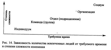 СТВ - системная технология вмешательства ОР - организационное развитие Говоря о проблемах как об изменениях и классифицируя их как «мягкие», «жесткие», с ограниченными и неограниченными измерениями, каждую ситуацию рассматривают отдельно от других ситуаций как некий дискретный, конкретный эпизод. В подавляющем числе случаев реальные проблемы и изменения не являются изолированными друг от друга, а пред-ставленны системой изменений и системой проблем с большой степенью сложности и разнообразия, что обусловлено взаимосвязанностью и взаимодействием проблем и большим количеством связей в самой системе изменений. Системы проблем, описанные с использованием рассмотренной классификации и различающиеся между собой, требуют и различных подходов и методов разрешения, хотя имеют общие черты и реализуются на основе некоторых общих принципов. Необходимо иметь в виду, что будущее формируется в настоящее время и, как правило, приходится управлять сразу обоими состояниями: настоящим и будущим, рассматривая изменения как новые возможности или новые угрозы. Как правило, изменения осуществляются под воздействием системы внутренних и внешних факторов. Выделяют следующие виды введения изменений: «сверху - вниз» (изменение вводится властным решением), «снизу - вверх» (в случае, когда предложение об изменении формируется как результаты работы внутренней группы или команды); иногда привлекают к работе специалистов, которых просят проанализировать и выявить проблемы, а также внедрить предложенные изменения (экспертный метод). Если требуется осуществить изменение быстро, то наиболее эффективным считается подход «сверху - вниз». Если не понятно, как именно решать проблему, которая на местах может восприниматься и решаться по-разному, то подходящим в этом случае считается подход «снизу - вверх». Такой подход может потребовать много времени на планирование и реализацию, а также специального подразделения для контроля и оценки осуществляемых изменений. Экспертный метод эффективен при введении новых технологий, обеспечивая проведение изменений без участия в нем руководства, «продолжающего управлять». В реальной ситуации изменений используются в той или иной степени все три подхода. Изменения бывают разных уровней. Уровень изменения определяется числом людей, которых затрагивают изменения. Можно выделить следующие уровни изменений: в отношении индивида, команды (группы), отдела (подразделения), организации, социума. Количество вовлеченных в процесс людей зависит от времени, необходимого на введение изменений, и от степени сложности изменений (см. рис. 14). Реакции на изменения у участников процесса могут быть различными. В качестве наименее важных из множества ролей, которые при этом могут играть участники, выделяют две: роль энтузиаста и роль скептика. Обе эти оппонирующие друг к другу роли необходимы в процессе осуществления изменения.