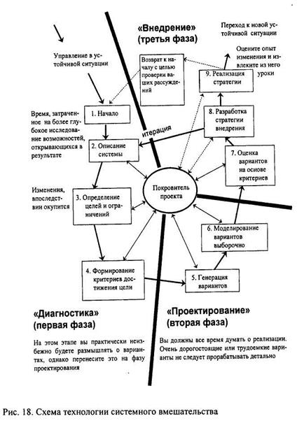 Модель диагностики Надлера - Ташмена можно использовать на каждом из этапов осуществления изменения для определения того, какие задачи необходимо решить на каждом из них, а затем оценить последствия изменения. Существует множество подходов к планированию и осуществлению изменений. Рассмотрим те из них, которые получили более широкое распространение, чем другие: системную технологию вмешательства, организационное развитие и методологию «мягких» систем. Для ситуаций относительно ограниченных изменений, когда ни один из факторов не является доминирующим, когда значения параметров «эмоциональная вовлеченность» и «техническая сложность» уравновешивают друг друга, а ситуация сравнительно близка к ограниченной, особенно успешно применяется метод управления изменениями, который называется «Системная технология вмешательства (СТВ)». Технология состоит из системы задач принятия решений, которые связаны между собой и решение которых осуществляется с использованием «жестких» моделей и методов принятия решений, хотя сама технология организована как некоторый процесс, что является характерным для большинства «мягких» методов. Процесс СТВ является коллективным и требует для разработки и реализации решений командной работы. Деятельность по управлению изменениями согласно методу СТВ делится на три в ряде случаев пересекающиеся между собой фазы: 1) диагностику; 2) проектирование; 3)внедрение - и представляет собой итерационный процесс, не сводящийся к линейному (см. рис. 18). Метод СТВ не представляется как строго детерминированная последовательность шагов, и этим он не похож на традиционное инженерное планирование проектов. Модель СТВ - это циклическая модель, организованная или как последовательное движение по циклу, или как заданный итеративный процесс (например, по принципу «два шага вперед, один назад»). Использование метода СТВ предполагает наличие участника с особой ролью - «покровителя» проекта, а также особую организацию отношений между ним и командой, осуществляющей изменения. Метод СТВ реализует подход «сверху - вниз» во главе с «покровителем» проекта, используя при этом сильные стороны системного подхода. Основное отличие СТВ от других подходов заключается в том, что, рассматриваю ситуацию как систему проблем, переходят к системе целей, критериев, оценок, моделей и т.д. с выходом на систему вариантов конечных решений. Процесс планирования неотделим от процесса реализации, поэтому продуктом СТВ является внедрение командой построенных ею систем. Любая фаза или шаг процесса СТВ предполагает их согласование с «покровителем» проекта и поддержку руководства. Не рекомендуется задерживаться на отдельных шагах: в случае необходимости всегда можно вернуться. Существенную роль в формировании различных систем в методе СТВ играют политические процессы и организационная культура, а также влияние неопределенности окружающей среды и вовлечение в процесс других участников (например, общественности). Разработка стратегии внедрения осуществляется по той же схеме, что и сам процесс изменения (см. рис. 18). СТВ - это творческий процесс с чередованием циклов дивергентного (расходящегося) и конвергентного (сходящегося) мышления. Заметим, что если процесс СТВ организован в соответствии с рекомендациями, то в соответствии с пе