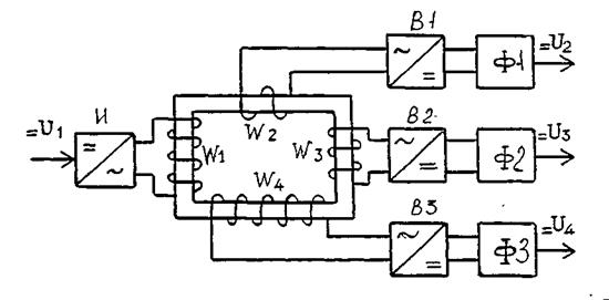 Для устранения недостатков, присущих непосредственным преобразователям постоянного напряжения и отмеченных выше, в более сложных по структуре силовой части преобразователях подобного назначения производится последовательное преобразование постоянного тока в переменный с напряжением прямоугольной или непрямоугольной формы, а последний затем вновь преобразуется в постоянный ток. Для выполнения такого двукратного преобразования электроэнергии силовая часть рассматриваемых преобразовательных устройств должна содержать два последовательно соединенных силовых элемента - высокочастотный транзисторный инвертор (регулируемый или нерегулируемый) и высокочастотный выпрямитель со сглаживающим фильтром. При этом электрическая изоляция выходных цепей преобразователя друг от друга и от источника электроэнергии, а также обеспечение требуемых номинальных значений выходных напряжений осуществляются с помощью высокочастотного силового трансформатора. Многоканальные преобразователи постоянного напряжения имеют две или более (на практике 15...20) электрически изолированных цепей постоянного тока с разными уровнями выходных напряжений, одноканальные - одну выходную цепь постоянного тока, электрически изолированную от источника электроэнергии. Функциональная схема трехканального ДППН показана на рис. 9.7. Для получения трех гальванически не связанных между собой и с входом каналов преобразователя в состав последнего включен (между инвертором и выпрямителем каждого канала) четырехобмоточный трансформатор Т. Выходное напряжение инвертора И подается на первичную обмотку w 1. Требуемая величина напряжения на выходе каждого канала (U 2; U 3; U 4) обеспечивается за счет определенного количества витков в обмотках w 2, w 3 и w 4 трансформатора T. На практике, как правило, в состав такого преобразователя включают входной и выходной фильтры. Входной фильтр обеспечивает развязку между высокочастотным инвертором и источником питания преобразователя. Выходные фильтры обеспечивают сглаживание пульсаций напряжения каждого канала. Применение ДППН в источниках вторичного электропитания РЭС позволяет получить не только ряд необходимых вторичных напряжений из одного первичного, но и повысить стабильность вторичных напряжений по сравнению с первичным. Выходное напряжение существующих первичных источников электропитания в процессе эксплуатации меняется. У большинства из них колебания напряжения лежат в пределах + (10...20)%. Допустимые колебания напряжения питания большинства ответственных приемников систем автономного электроснабжения РЭС на порядок меньше и составляют ±(3...5%), а отдельных (выходные каскады в аппаратуре связи) еще более чувствительны к изменению напряжения питания, и того меньше - всего ±(0, 1...0, 5)% [1].