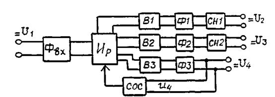 Отсюда вытекает необходимость стабилизации выходных напряжений преобразователя. Все многообразие встречающихся на практике стабилизированных двухзвенных высокочастотных преобразователей постоянного напряжения можно свести к относительно небольшому числу типовых многоканальных унифицированных функциональных схем, одна из которых изображена на рис.9.8. Наиболее простая функциональная схема (рис.9.8) содержит регулируемый высокочастотный транзисторный инвертор Ир, с выхода которого переменное напряжение подается на выпрямители В 1... В 3, обычно содержащие, помимо блоков вентилей, высокочастотные трансформаторы. Указанные выпрямители с выходными фильтрами LC -типа Ф1, Ф2, Ф3 преобразуют переменное напряжение в постоянное, одновременно сглаживая пульсации. Централизованная стабилизация одновременно всех выходных напряжений преобразователя достигается изменением относительной длительности импульсов переменного напряжения на выходе регулируемого инвертора Ир под действием сигнала обратной связи, снимаемого со схемы обратной связи (СОС). Последняя может быть подключена принципиально к любому одному (обычно наиболее мощному) выходу стабилизированного преобразователя.