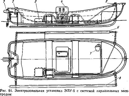 / — човновий мотор; 2 — кормові штанги для підвішування електродів; 3 — імпульсний генератор; 4 — джерела живлення|харчування|; 5 — носові штанги для підвішування элекхро-дов|; 6 — анод; 7 — педаль безпеки; 8 — катод на виході 400—600 В, діапазон частоти проходження|дотримання| імпульсів 10—100 Гц. При роботі установки створюється електричне поле постійного| струму|току|. Риба, потрапивши|попавши| в це поле, рухається|сунеться| до анода, наркотизує і виловлюється сачками. Питома електрична провідність води в місцях лову повинна складати від 10 до 200 мСм/м..ЭЛУ-5| використовують для електролова риби на мілководих|мілководних| (до 2 м) ділянках озер, річок|рік|, водосховищ і неспускових ставків, де лов іншими знаряддями утруднений.