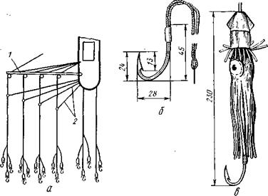 Лов вудками|вудочками|. У морському рибальстві широко розвинений вудковий| лов тунця. Тунцеловна| вудка|вудочка| (малюнок 2) складається з вудилища|вудлища| (звичайно бамбукового) завдовжки 4, 5—5, 0 м. До верхнього кінця вудилища|вудлища| підв'язують металеве кільце або петлю для приєднання лесы|. Лесой служить синтетичний мотузок|вірьовка| або шнур. До нижньої частини|частки| повідця|, іноді|інколи| через вертлюга, прикріплюють|скріпляють| суцільний або складений|складовий| поводок з|із| мононитки, сталевого троса адіаметром від 0, 5 до 1, 5 мм. До кінця поводка прикріплюють|скріпляють| гачок без борідки. |із| Поводець| звичайно на 30— 50 см коротше за вудилище|вудлище|. При лові крупного|великого| тунця вудка|вудочка| іноді|інколи| має не 1, а 2—4 вудилища|вудлища| на один гачок.Для лову тунця використовують живу|жваву| приманку (анчоуса, сардину), яку відловлюють невеликими неводами гаманців або бортовими підхопленнями і зберігають в цистернах (50—100 кг на 1 т води). Воду постійно міняють|змінюють, замінюють| за допомогою могутніх насосів. Ловить |добуває| приманку само| або інше судно. У першому випадку з одного борту ловлять вудками|вудочками|, а з іншого здобувають|добувають| приманку. Виявивши косяк|одвірок| тунця, судно пристроюється|прибудовується, влаштовується, улаштовується| в голові косяка|одвірка| і як би веде його за собою, розкидаючи живу|жваву| приманку. Щоб утримати косяк|одвірок| у|в, біля| борту, замаскувати тіні від судна і ловців, привернути|привабити, залучити, притягати| тунця, з великої відстані на поверхню моря спеціальною дощувальною системою розбризкують морську воду. Кожен вудильник має широкий пояс з|із| шкіряною прокладкою|прокладенням|. У центрі прокладки|прокладення| укріплена|зміцнена| мотузяна петля. У петлю пропускають нижній кінець вудилища|вудлища|, підстава|основа, заснування| якого упирається в прокладку|прокладення|. Вудильники стоять на спеціальних стаціонарних або відкидних майданчиках. Уловивши момент натягнення волосіні, ловець одним помахом викидає тунця на палубу. Іноді|інколи| крупного|великого| тунця піднімають|підіймають| декілька вудильників. Облов одного косяка|одвірка| продовжується|триває| від декількох хвилин до однієї години. За цей час рибак|рибалка| може зловити до 200—300 тунців. Для полегшення праці рибаків|рибалок| при вудковім| лові тунця розроблені різні механізовані пристрої|устрої|, зокрема автоматичні. Робочий цикл одного з таких пристроїв|устроїв| складається з шести тактів: робоче положення|становище|, сіпання, підйом, автоматичне скидання риби, опускання в робоче положення|становище|. Всіма вудками|вудочками| управляє один оператор з центрального пульта. Відомі конструкції електровудки|вудочки| для лову тунця. При захопленні|захваті| гачка тунцем електричний ланцюг|цеп| замикається, риба вражається|приголомшується| електричним струмом|током|. При цьому витягнути її на палубу не складає труднощів. Окрім|крім| вудкового| лову тунця, досить широко застосовують донний і придонний його |лов. Типовим є|з'являється, являється| |лов морського окуня, тріски, палтуса і інших донних і придонних риб. Снасть складається з хребтини і повідців|. Хребтину виготовляють з вірьовки чи |із| мононитки або комплексної нитки. Довжина хребтини залежить від глибини лову. До хребтини через вертлюга кріпл