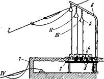 Малюнок 4 Схема установки для вибірки тролів|: / - /// — бортові троли|; І V — кормовий трол|; 1— корма судиа|; 2 — стаиииа| лебідки; 3 — барабани