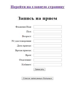 Первый пункт главной страницы перенесет нас на форму записи на прием, где после заполнения всех необходимых полей и нажатия кнопки записать, перенесет данные непосредственно в базу данных в соответствующую таблицу.