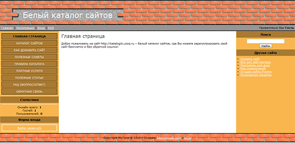 Удалите <! -- < bc> --> $LOGIN_FORM$<! -- < /bc> --> и вместо него вставьте следующий: < div id=" login" > < a href=" #" onclick=" window.open('https://login.uid.me/? site=0 ЗДЕСЬ_ДОЛЖНО_БЫТЬ_НАЗВАНИЕ_САЙТА & amp; ref='+window.location.href, 'unetLoginWnd', 'width=500, height=350, resizable=yes, titlebar=yes'); return false; " > Войти через uID< /a> < /div> Вместо ЗДЕСЬ_ДОЛЖНО_БЫТЬ_НАЗВАНИЕ_САЙТА нужно вставить название сайта. В моём случае, katalogik.ucoz.ru — адрес сайта, а katalogik — название сайта. Значит я вставляю следующий код: < div id=" login" > < a href=" #" onclick=" window.open('https://login.uid.me/? site=0katalogik& amp; ref='+window.location.href, 'unetLoginWnd', 'width=500, height=350, resizable=yes, titlebar=yes'); return false; " > Войти через uID< /a> < /div> Вы же вставляете название своего сайта. Нажмите «Сохранить» и обновите дизайн сайта. На данный момент мы видим обычную ссылку серого цвета. Чтобы изменить вид ссылки, нужно задать стили для #login. Зайдите в админке в Дизайн -> Управление дизайном (CSS) и вставьте следующие стили в таблицу CSS: #login {text-align: center} /*Устанавливает элементы внутри блока по центру */ Сохраните изменения и обновите сайт. Ссылка для входа пользователей расположена по центру, у неё теперь белый цвет, она подчёркнута, и при наведении на неё курсора мыши подчёркивание исчезает. Осталось немного доработать форму входа. Я предлагаю сделать двойную рамку вокруг ссылки «Войти через uID». Для этого в #login мы добавим следующие значения (красным цветом то, что нужно добавить): #login {text-align: center; border: 4px double #FFFFFF; padding: 5px; } , где Нажмите «Сохранить» и обновите главную страницу сайта. Теперь форма входа гармонично смотрится с нашим дизайном сайта. Как говорится, простенько, но со вкусом Нам осталось изменить цвет текста в левом меню, когда открываются категории каталога. Зайдите в раздел «Каталог сайтов», и Вы увидите следующую картину в левом меню: