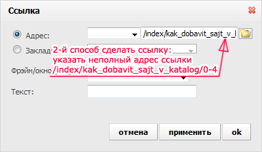 В моём случае нужно скопировать ссылку /index/kak_dobavit_sajt_v_katalog/0− 4 и затем вставить её в поле «Адрес». Левое поле оставляем пустым.