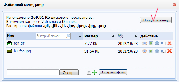 Перейдите в созданную папку и нажмите «Обзор». Нам нужно выбрать среди файлов, которые Вы скачали на странице уроков по созданию сайта на ucoz.ru, картинку katalogik.jpg. Загрузите её на сайт.