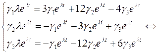 Ответ: 14. Найти общее решение системы ДУ: Решение: Будем решать эту систему алгебраическим методом. Ищем решения в виде Подставим в систему, получим: