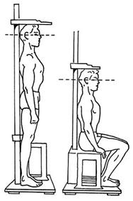 Рост стоя и сидя измеряется ростомером(рис. 3.1).При измерении ростастоя пациент становится спиной к вертикальной стойке, касаясь ее пятками, ягодицами и межлопаточной областью. Планшетку опускают до соприкоснове-ния с головой. При измерении роста сидя пациент садится на скамейку, касаясь вертикальной стойки ягодицами и межлопаточной областью.