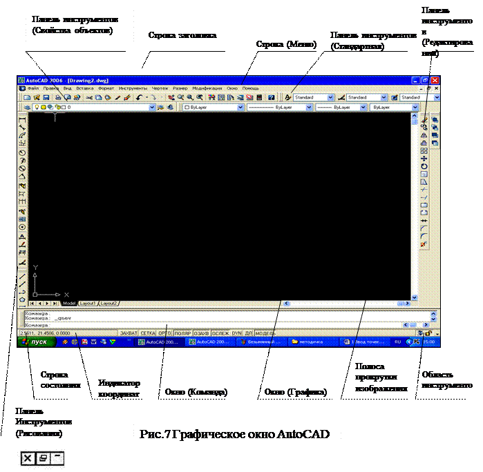 После загрузки программы появляется графическое окно AutoCAD (рис. 7), которое содержит основные элементы интерфейса и область, где выполняется черчение. В заголовке этого окна выводится наименование программы и имя файла с его расширением. По умолчанию AutoCAD присваивает всякому вновь создаваемому файлу имя Drawingl.dwg, которое, во избежание недоразумений, следует сразу же изменить, воспользовавшись меню File | Save As (Файл | Сохранить как) для вызова команды сохранения файлов. В правой части заголовка окна имеется три кнопки (рис 8). С помощью первой кнопки (с горизонтальной чертой) можно свернуть окно программы на панель задач, вторая управляет размерами графического окна, а третья (с крестиком) предназначена для выхода из программы. Под заголовком окна строка меню, в конце которой размещены такие же три кнопки, что и в строке заголовка. Эти кнопки предназначены для управления окном текущего рисунка. В третьей строке графического окна находятся стандартная панель инструментов и панель с выпадающими списками текстовых и размерных стилей. Четвертая строка содержит панель управления слоями и панель свойств объектов. Все панели плавающие, т. к. могут перемещаться по поверхности графического окна, если зацепить их левой кнопкой мыши за два вертикальных ребра в начале панели и удерживать кнопку. Самая нижняя строка графического окна называется строкой состояния. В левой ее части выводятся координаты X, Y, Z (при плоском черчении координата Z всегда равна 0) положения курсора в зоне рисования окна, а в средней части находятся кнопки, которые управляют вызовом прозрачных команд. Эти команды могут выполняться во время исполнения любой другой команды. Выше строки состояния находится окно команд, которое по умолчанию состоит из 3 строчек, начинающихся со слова Command: (Команда). Первая снизу строка активная — в нее вводятся команды и данные, которые управляют работой программы. Любая комбинация символов, набираемая на клавиатуре, автоматически попадает в активную строку команд. В нижней части окна рисунка находится вкладка Model (Модель) и одна или несколько вкладок Layout (Лист). Вкладка Model (Модель) обеспечивает доступ в пространство модели, в котором обычно и создаются чертежи. Пространство листа используется для выполнения компоновки чертежа перед выводом его на печать или созданием подшивки листов.