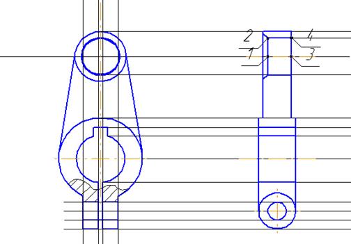 Рис.34 15.1. Вызовите Панель расширенных команд построения отрезов и нажмите кнопку Параллельный отрезок. 15.2. Для построения параллельного отрезка укажите вертикальный отрезок. 15.3. В качестве начальной точки укажите точку – 1. 15.4. В поле Длинна отрезка в Строке параметров, введите значение - 8 и нажмите “Enter”. 15.5. С помощью команды Ввод отрезка постройте отрезок под углом - 2 градуса. 15.6. В качестве начальной точки укажите точку – 2. 15.7. В поле Угол наклона отрезка введите значение - 2 и нажмите клавишу “Enter”. 15.8. Конечную точку зафиксируйте с помощью привязки Ближайшая точка. 16. Для построения фаски. 16.1. На Инструментальной панели Геометрия в Строке параметры объекта в поле Длинна введите значение - 2, в поле Угол введите значение – 45 градусов, элемент 1 - не усекать, элемент 2 – усекать. 16.2. И последовательно укажите курсором на два отрезка, между которыми необходимо построить фаску. 17. Вторую половину отверстия постойте с помощью команды Симметрия. 18. Вернитесь к построению главного вида и закончите построение верхнего отверстия. 18.1. Включите кнопку Ввод окружности на странице Геометрия Инструментальной панели. 18.2. С помощью привязки Пересечение укажите точку центра окружности диаметром – 16мм. 18.3. Для определения радиуса окружности щелчком правой клавишей мыши поле Радиус окружности в Строке параметров вызовите на экран меню Геометрического калькулятора и выполните из него команду Между двумя точками; 18.4. Укажите точки – 3 и 4 система занесет это значение в поле Радиус окружности в Строке параметров и выполнит построение окружности (рис.35).