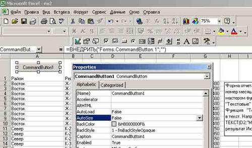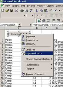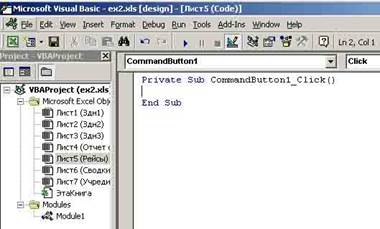 Вставка элемента управления в интерфейс листа Рейсы с вызовом свойств кнопки и далее исходного текста в редакторе VBA. Если копировать текст программы из модуля (результат записи макроса) в подпрограмму кнопки, то нажатие на кнопку будет приводить к вставке формул на лист «Рейсы». Аналогично оформляются все остальные кнопки, у каждой из которых будет свое функциональное назначение.