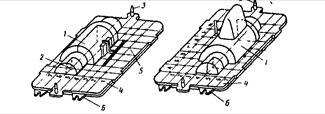 На рис. 3 представлен другой вариант модельной плиты. В этом случае к модели привинчивается накладка в виде ласточкина хвоста, которая входит в соответствующий паз, выфрезерованный в модельной плите. Модельными плитами этого типа пользуются, главным образом, для формовки на встряхивающих машинах с поворотным столом. Универсальные плиты можно заменять «модельными рамами» внутри которых крепятся деревянные модельные плиты. Такое решение выгодно, когда модельная плита имеет фасонную выгнутую поверхность разъема. На рис. 4 показана стальная литая модельная рама, внутри которой установлена деревянная модельная плита. Опока ставится на раму по прикрепленным к ней направляющим штырям.