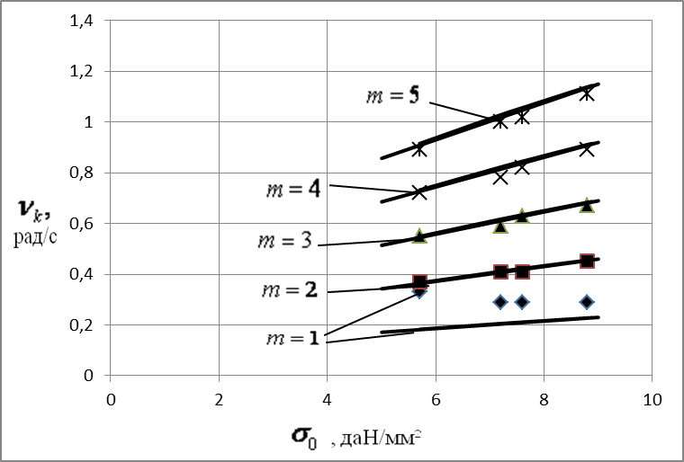 Экспериментальная частота крутильных колебаний РФ. Одной из задач анализа является оценка соответствия между теоретической и экспериментальной частотой свободных крутильных колебаний расщепленной фазы (РФ) высоковольтных ЛЭП. Существенные расхождения в этом случае могут привести к заметным ошибкам при расчете параметров пляски проводов. Для решения сформулированной задачи была проведена серия экспериментов на опытном полигоне КазНИИЭ им. акад. Ш.Ч. Чокина, при которых измерялась собственная крутильная частота РФ. Опыты проводились в безветренную погоду, с проводами различных марок при широком диапазоне изменения натяжения. Варьировались также число полуволн и длина пролета и число расщепления фазы. Экспериментальная оценка крутильных частот РФ осуществлялось следующим образом: фиксировались секундомером время, необходимое для совершения РФ нескольких циклов колебаний (обычно 10 полных колебаний). Крутильная частота определялось путем деления число колебаний на фиксированное время. Начальное натяжение провода в процессе эксперимента фиксировались динамометром. При обработке опытных данных использованы вместо начального натяжения Экспериментальные данные по частотным характеристикам проводов высоковольтных ВЛ приведены на рисунках 1 – 4, 8. На рисунках построены зависимость частоты от начального напряжения и число полуволн по экспериментальным данным (точечные изображения), а также построены аппроксимирующие теоретические кривые (сплошные кривые). Аппроксимирующие кривые вычислен по формуле, известные из области теорий колебаний струны /1 /.
