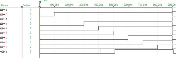 Рис. 6.8 Матрица временных задержек Программа: TITLE " porogovay_shema_5_9"; SUBDESIGN porogovay_shema_5_9 ( a, b, c, d, e, f, g, h, k: INPUT; y: OUTPUT; ) VARIABLE z: NODE; BEGIN z = a + b + c + d + e + f + g + h + k; IF z> =5 THEN y = VCC; ELSE y = GND; END IF; END;