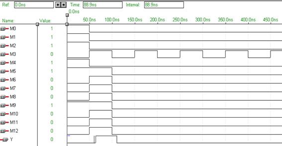Рис 6.13 Матрица временных задержек Программа: SUBDESIGN mazoritarny_element (M[0..12]: INPUT; Y: OUTPUT;) VARIABLE A, L; BEGIN A = M0+M1+M2+M3+M4+M5+M6+M7+M8+M9+M10+M11+M12; IF A> = L; THEN Y = VCC; ELSE Y = GND; ENDIF; END; В интегральном исполнении выпускаются мажоритарные элементы (Majority Logic Gate), имеющие 3 (533ЛПЗ и 561ЛП13) и 5 (МС14530В) входов. Функция, выполняемая 3-входовым. МЭ, совпадает с функцией переноса одноразрядного сумматора: f=X1X2VX1X3VX2X3, где Xp— входные сигналы функционирование 5-входового МЭ МС14530B описывается выражением: F=(I1I2I3VI1I2I4VI1I2I5VI1I3I4VI1I3I5VI1I4I5VI2I3I4VI2I3I5VI2I4I5VI3I4I5)Å P, (6.1) где P (Polarity) — сигнал инвертирования функции выхода МЭ. Из соотношения (1) при подстановке определенных значений некоторых сигналов следует, что 5-входовой МЭ может использоваться для выполнения различных переключательных функций: I5=1, I4=0 => F = (I1I2 V I2I3 V I2I3) Å Р – 3-входовой МЭ, с возможностью инвертирования функции выхода F, I5=I4=0 => F=I1I2I3Å Р– 3-входовой ЛЭ И/И-НЕ, I5=I4=1 => F=(I1 V I2 V I3)Å P – 3-входовой ЛЭ ИЛИ/ИЛИ-НЕ, I5=I4 => F=(IlI2IЗ V I1I4 V I2I4 V I3I4)Å Р – 4-входовая пороговая схема с порогом L = 3 и неравными весами входов (вход I4 имеет вес вдвое больший, чем остальные входы) с возможностью инвертирования функции выхода.