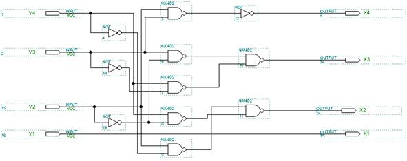 В таблице 6.5 приведены: ДЧ - десятичное число, ДЦЧ - двоично-десятичное число, С - сдвиг, К - коррекция, МР - младший разряд. Если в старший разряд тетрады, имеющей множитель 10j, поступает единица, то она приобретает вес 8*10j. До сдвига эта единица имела вес 10i+1, поэтому для получения при сдвиге деления на два ей следует приписать вес 2-1*10j+1. Из этого следует, что необходимо произвести коррекцию на число 8*10j - 2-1*10j+1, т.е. вычесть число 3*10j. Если в старший разряд какой-либо тетрады поступает нуль, то коррекцию производить не нужно. Из таблицы видно, что после сдвига числа 9653 и соответствующей коррекции действительно получается число 4826, отличающееся от 9653*2-1 на единицу, которая является младшим разрядом младшей тетрады двоично-десятичного кода и младшим разрядом двоичного кода. Если вы строите преобразователя двоично-десятичного кода в двоичный код на элементах И-НЕ, то рассуждения как и для предыдущего преобразователя. Получим схему: