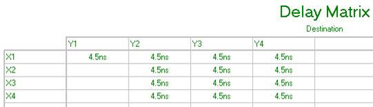 Рис. 6.42 Матрица временных задержек Программа: CONSTANT t=3 SUBDESIGN preobraz_dvoich_v_kod_greay (X[3..0]: INPUT; Y[3..0]: OUTPUT; ) VARIABLE q[3..0]: NODE; BEGIN FOR i IN 0 TO t GENERATE X[i+1] = q[i]; END GENERATE; q[3] = GND; Y[3..0] = X[3..0] $ q [3..0]; END;