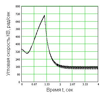 Рис.2, г. Расчетный режим двигателя ВАЗ-1111: от 0 до 1-й секунды происходит открытие дроссельной заслонки (разгон), в момент 1, 2 сек происходит нагружение моментом потребителя (торможение и выход на стационарный режим)