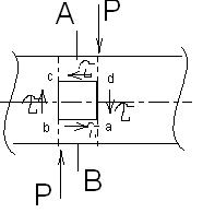 Приложим к брусу 2 равные противоположные силы, находящиеся на близком расстоянии. Такой брус будет испытывать деформацию сдвига. Из бруса можно выделить АВСD, на грани которого будут действовать касательные напряжения. Если на грани элемента будут действовать только касательные напряжения, то такое называется чистым сдвигом, а грани этого элемента – площадка чистого сдвига. Если силы Р достаточно большие по величине и расположены достаточно близко, то произойдет отделение правой части бруса от левой по сечению АВ