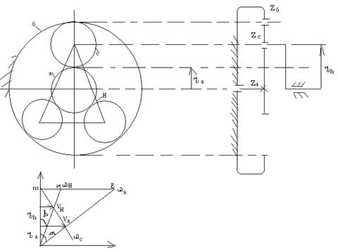 а – центральное зубчатое колесо, с – сателлит, б – неподвижное, Н – водило.
