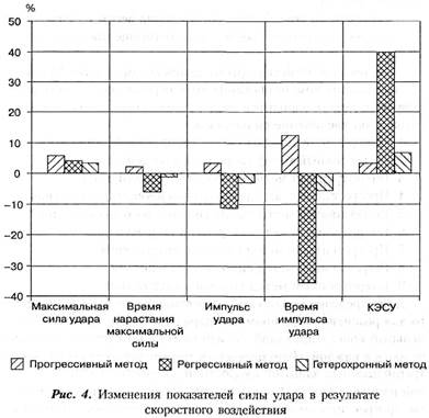 Разработка вариантов комплексного воздействия различных тренировочных средств на развитие силы прямого удара рукой показала, что их необходимо применять в сочетании друг с другом в определенной последовательности, учитывая два принципа – очередности и суммарного веса отягощений. Принцип очередности можно применять, используя методы: – с постепенным увеличением веса отягощений - прогрессивный метод; – с постепенным уменьшением веса отягощений - регрессивный метод; – с изменением веса отягощений: с меньшего на больший и с большего на меньший - гетерохронный метод. Принцип суммарного веса отягощений можно применять, используя методы: – скоростного воздействия (отягощения весом в сумме 5 кг); – скоростно-силового воздействия (отягощения весом в сумме 10 кг); – силового воздействия (отягощения весом в сумме 15 кг). В результате комбинирования вышеперечисленных методов мы получили девять вариантов воздействия скоростно-силовой подготовки на увеличение силы удара. 1. Прогрессивный метод скоростного воздействия. 2. Регрессивный метод скоростного воздействия. 3. Гетерохронный метод скоростного воздействия. 4. Прогрессивный метод скоростно-силового воздействия. 5. Регрессивный метод скоростно-силового воздействия. 6. Гетерохронный метод скоростно-силового воздействия. 7. Прогрессивный метод силового воздействия. 8. Регрессивный метод силового воздействия. 9. Гетерохронный метод силового воздействия. Для определения наиболее эффективного метода, необходимого для развития силы прямого удара рукой, был проведен параллельный констатирующий эксперимент на трех группах по десять человек в каждой. Использовалось три микроцикла по 10 учебно-тренировочных занятий: скоростной, скоростно-силовой и силовой направленности. Первая группа тренировалась с применением прогрессивного метода, вторая - регрессивного и третья – гетерохронного. В микроцикле скоростной направленности применялись отягощения весом 5 кг, в скоростно-силовом - 10 кг, силовом - 15 кг. Первоначальный уровень подготовленности занимающихся был примерно одинаковым. В результате проведенного микроцикла скоростной направленности было установлено, что прогрессивный и гетерохронный методы не привели к достаточному росту исследуемых показателей, а регрессивный метод создал условия для значительного улучшения: времени импульса удара - на 35, 7%, импульса удара - на 11, 3%иКЭСУ-на41, 2%. Следует отметить, что прогрессивный метод скоростного воздействия приводит к угнетению быстрых волокон мышц и ухудшению временных показателей силы удара (рис. 4). Из полученных результатов следует, что при развитии скоростного компонента силы удара целесообразно изменять величину нагрузки в каждом подходе регрессивным методом.