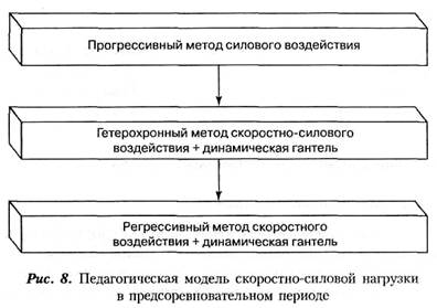 На основании системно-структурного анализа тренировок единоборцев в ударных видах спорта была разработана педагогическая модель скоростно-силовой нагрузки в предсоревновательном периоде (рис. 8). Педагогическая модель состоит из трех блоков подготовки: силового, скоростно-силового и скоростного, направленных на развитие силы прямого удара рукой у единоборцев.