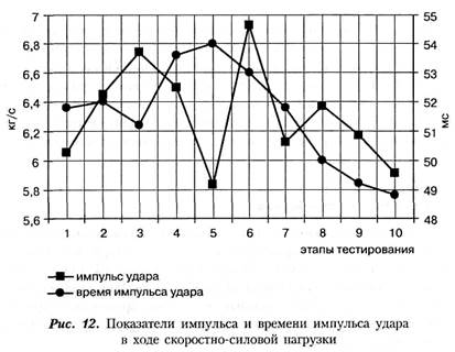 Во втором микроцикле применялись средства скоростно-силовой нагрузки, после которой показатели силы удара в экспериментальной группе изменялись следующим образом (рис. 11, 12). Показатели максимальной силы и времени нарастания удара постепенно увеличивались в течение всего микроцикла (рис. 11). Таким образом, видно, что скоростно-силовое воздействие на организм спортсменов привело к увеличению максимальной силы и улучшению времени нарастания максимальной силы удара. Отставленный тренировочный эффект силового воздействия включил адаптационные механизмы организма и привел к значительному увеличению скоростно-силового потенциала удара.