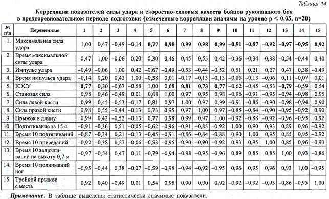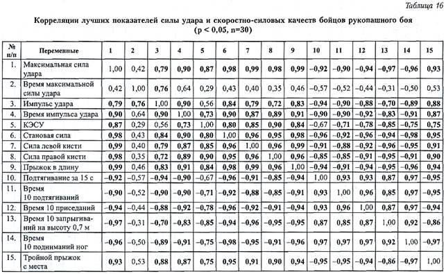 Для решения этой задачи был проведен корреляционный анализ между пятнадцатью наилучшими показателями, характеризующими ударную технику и скоростно-силовые качества спортсменов (табл. 16). Анализ показал, что на уровне высоких характеристик развития максимальной силы удара, КЭСУ и других тестов, характеризующих ударную технику, существует высокая статистическая связь с данными силовой и скоростно-силовой подготовленности спортсменов. Это подтверждает, что базовой основой ударной техники бойцов-единоборцев является силовая и скоростно-силовая подготовка. Единственным показателем, выпадающим из этой зависимости, является время максимальной силы удара, его связь с силовыми и скоростно-силовыми качествами оценивается как умеренная и средняя. Как было показано в предыдущих исследованиях, для его совершенствования необходимо применять средства импульсионно-динамического характера.