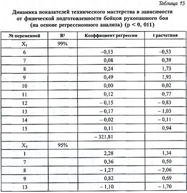 Построение модели в форме регрессии в наших исследованиях оправдано по двум причинам. Во-первых, потому что математическое описание зависимости между переменными позволяет установить наличие взаимной причинной связи, во-вторых, для получения предикторов для зависимой переменной. При исследовании показателей технической подготовленности бойцов рукопашного боя отсутствовала априорная информация о порядке независимых первичных показателей скоростно-силовой подготовленности по их важности для предсказания зависимой переменной. Для решения вопроса об исключении части переменных с незначительными статистическими коэффициентами нами применялся пошаговый регрессионный анализ. В процессе применения пошаговой регрессии независимые переменные одна за другой включались в подмножество согласно предварительно заданному критерию. С помощью пошаговой процедуры определяли упорядоченный список предикторов. Для получения наилучшего подмножества из этого списка выбирались несколько таких независимых переменных, которые возможно лучше предсказывали бы зависимую переменную - тот или иной показатель тактико-технической подготовленности спортсменов. Критерий зависимости переменной для уровня регрессий основывался на уменьшении сумм квадратов, и независимая переменная, наиболее влияющая на это уменьшение в самом шаге, вводилась в регрессию. В результате применения пошагового линейного регрессионного анализа получены следующие модели, позволяющие предположить вероятный прогноз технических показателей соревновательной деятельности спортсменов в зависимости от показателей тестирования скоростно-силовых качеств. Обозначение показателей: Х1 - максимальная сила удара; Х2 - время максимальной силы удара; Х3 - импульс удара; Х4 - время импульса удара; Х5 - КЭСУ; Х6 - становая сила; Х7 - сила левой кисти; Х8 - сила правой кисти; Х9 - прыжок в длину; Х10 - подтягивание за 15 с; Х11 - время 10 подтягиваний; Х12 - время 10 приседаний; Х13 - время 10 запрыгиваний на высоту 0, 7 м; Х14 - время 10 подниманий ног; Х15 - тройной прыжок с места. По результатам корреляционного анализа видно, что сильную статистическую связь имеют две переменные: максимальная сила удара и КЭСУ, поэтому для них был проведен регрессионный анализ, позволяющий определить зависимость этих показателей с наиболее весомыми переменными, характеризующими скоростно-силовые качества спортсменов. В результате применения пошагового линейного регрессионного анализа с помощью программного продукта компании StatSoft Статистика 6.0 получены следующие модели, позволяющие предположить вероятный прогноз технических показателей бойцов-единоборцев в зависимости от показателей тестирования скорост-но-силовых качеств: • максимальной силы удара: X1 = -0, 306 Х6 + 0, 327 Х7 + 1, 248 Х8 + 2, 163 Х9 + 0, 062 Х10 + 4, З Х11 -30, 839 Х12 - 65, 791 Х13 - 5, 209 Х14 + 1, 256 Х15 - 321, 813; • КЭСУ: Х5 = 0, 087 Х1 + 0, 083 Х7 - 0, 15 Х8 + 0, 3276 Х9 - 21, 595 Х13 - 49, 569.