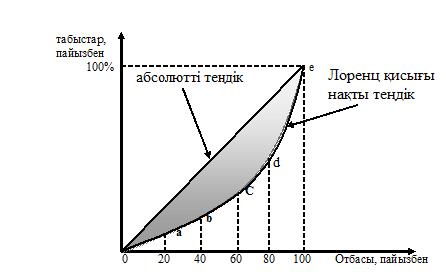 Сурет 14.2 Лоренц қ исығ ы 14.2-суретіне сә йкес, «отбасылар ү лесі» абсцисса осіне, «табыстар ү лесі» ордината осіне орналасқ ан. Табыстардың абсолютті тең бө лінуі ое биссектрисасымен берілген, мұ нда 20%-отбасы табыстың 20%-н алады, 40%-отбасы табыстың 40%-н алады жә не солай кете береді. Табыстардың нақ ты дә режеде бө лінуі а, в, с, d, e нү ктелерімен сипатталады. Абсолютті тең дік сызығ ы мен Лоренц қ исығ ы арасындағ ы боялғ ан бө лігі табыстардың тең сізігін кө рсетеді: бұ л аралық бө лігі ұ лғ айғ ан сайын табыстарды бө лудегі тең сіздіктер де арта тү седі. Жеке табыстан салық тарды алып тастағ аннан кейін жә не трансферттік тө лемдерді тө леп болғ аннан кейін адамдардың табыстары біршама тепе-тең дік жағ дайғ а жақ ындайды (сурет 14.3).