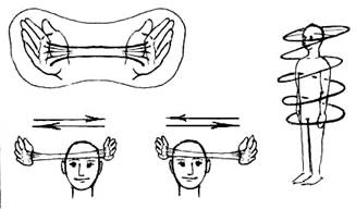 Закончив работу с внешней формой Учитель подходит к Ученику и становится у него за спиной. 1. С первым пунктом всё ясно, пояснения не нужны. 2. Учитель стоит за спиной Ученика. Учитель делает вихреобразные пасы-взмахи руками возле тела Ученика, не касаясь его. Учитель делает вихреобразные пасы-взмахи с общим направлением движения от пяток к макушке вдоль оси симметрии тела Ученика. Над макушкой руки разводятся в стороны и опускаются вдоль боков. (Рис. 8) Повторить 5-6 раз. Таким образом Учитель активизирует подъём энергии по заднесрединному меридиану, а также в руках и ногах Ученика. 3. Учитель стоит с левого бока Ученика. Учитель держит левую руку перед Учеником, а правую сзади на расстоянии 10-15 см от тела. Обе руки расположены по оси симметрии тела Ученика. Правая рука Учителя совершает вихреобразные пасы-взмахи и при этом поднимается от пяток к макушке. Левая ладонь (экран) одновременно поднимается вместе с правой, но ровно, без взмахов и всё время находится на одном с ней уровне. Левая ладонь всё время повёрнута к телу Ученика. Когда правая ладонь Учителя поднимется до макушки Ученика Учитель переводит правую ладонь верёд и плавно опускает обе руки вместе ладонями вниз вдоль оси симметрии спереди тела Ученика. (Рис. 9) Повторить 5-6 раз. Таким образом Учитель активизирует движение энергии по кольцу бессмертия (оно же ¾ малая космическая орбита ¾ из промежности вверх по заднесрединному меридиану в макушку и из макушки вниз по переднесрединному меридиану в промежность). 4. Учитель стоит лицом к Ученику. Учитель делает вихреобразные пасы-взмахи руками вдоль боков тела Ученика от пола к плечам, над плечами заводит ладони вдоль шеи к затылку и от затылка к макушке. От макушки вниз по прямой. (Рис. 10) Повторить 5-6 раз. Таким образом Учитель активизирует спуск энергии по переднесрединному меридиану, а также движение энергии по рукам и ногам. 5. Учитель находится с правого бока Ученика. Движения те же, что и в п.4, только левая рука работает сзади, правая ¾ спереди (экран). Повторяет движения 5-6 раз (рис.11).