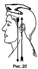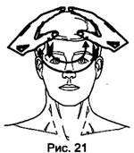 Диагональная " прокачка" головы потоком энергии осуществляется от левого затылочного бугра к правому виску и обратно. Затем происходит смена рук: от правого затылочного бугра к левому виску, от левого виска ¾ к правому затылочному бугру. Позиция № 4, рис. 20 Приложить ладони правой и левой рук параллельно друг другу на затылочно-теменную часть головы. " Прокачка" головы потоком энергии осуществляется аналогично позиции №1. Позиция № 5, рис. 21 Одну ладонь расположитьна теменной области головы и мысленно направлятьпоток энергии вертикально вниз ¾ вверх, от головы через позвоночник обратно. В каждой позиции количество повторений может составлять от 10 до 20 раз в зависимости от силы потока энергии и реакции на ощущения в голове Ученика. Через 3-4 занятия количество движений в упражнении может быть увеличено.