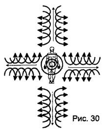 Упражнение направлено на развитие сосудистой, мышечной, энергетической систем зрительных анализаторов. Упражнение 14 АКТИВИЗАЦИЯ ЭНЕРГИИ ВО ВСЁМ ТЕЛЕ В ПОЛОЖЕНИИ ЛЁЖА (горизонтальная " прокачка") ( Рис.30, 31) Исходное положение: Ученик лежит на животе, руки расположены вдоль туловища, расслаблены. Методика выполнения 1. Учитель должен активизировать Ученику центр, связанный с клеточным уровнем (в области пупка): приглаживающими движениями обеих ладоней законтактировать с этим центром Ученика и короткими плавными взмахами поднять энергию ладонями вверх " фонтанчиком" на высоту вытянутых рук. После этого следует плавно возвратить ладони. Повторить упражнение 3-5 раз до появления ощущений плотности энергии в руках. 2. Захватив ощущение энергии из центра, растягивающими вихреобразными движениями рук отвести энергопоток в сторону ног Ученика, отходя от него на расстояние 5-7 м. Сделать движения, подобные " взбиванию перины", тем самым активизируя энергию вихреобразными движениями рук 3-5 раз. Не прекращая движения рук, возвратиться к Ученику. 3. Далее следует выполнять комплексы активизации энергии, как описано в п.2, в направлении левого бока, головы и правого бока Ученика.