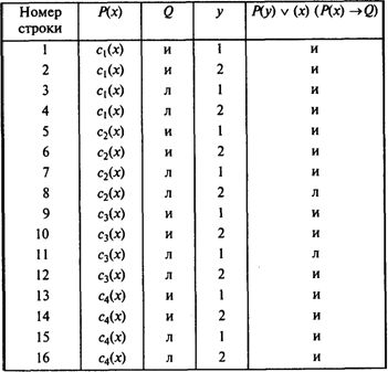Этот пример показывает, что построение таблицы истинности для исчисления предикатов составляет несравненно более трудную задачу, чем построение таблицы для исчисления высказываний. В самом деле, если универсум рассуждения будет состоять из 10 элементов, то для этого придется построить 210 = 1024 семантические функции только для одной независимой переменной, а число строк в таблице в огромной степени возрастает по мере усложнения формул. В нашем примере речь шла только о двух объектах универсума рассуждений, а формула была крайне проста. Поэтому к таблицам истинности в исчислении предикатов обращаются главным образом для иллюстраций, используя для этого весьма простые формулы с крайне ограниченным универсумом рассуждений. Тем не менее аналогия с исчислением высказываний оказывается весьма полезной для объяснения таких понятий, как общезначимая (или тождественно истинная) формула исчисления предикатов и логическое следование в этом исчислении. Формула А считается общезначимой в исчислении предикатов, если при всяком выборе универсума рассуждений (области ее значений) столбец ее значений в таблице будет состоять только из истин. Если универсум будет фиксирован, то формула называется общезначимой только в этом универсуме. Поскольку проверка формулы на общезначимость, как мы видели, представляет собой крайне трудную задачу, то выход часто ищут в противоположной операции: в установлении необщезначимости формулы. Для этого в принципе достаточно найти такую единственную строку в таблице, где формула принимает ложное значение. В приведенном выше примере (см. табл.13) этими строками являются 8 и 11. В некоторых случаях поиск необщезначимой формулы может быть ускорен, если воспользоваться сокращенными способами, основанными на определениях логических операций дизъюнкции, конъюнкции и импликации. Например, если нам было бы известно, что один из дизъюнктивных членов рассматриваемой формулы был бы истинен, тогда истинной была бы вся формула. Если же ложным оказался один член конъюнкции, то вся формула окажется ложной.