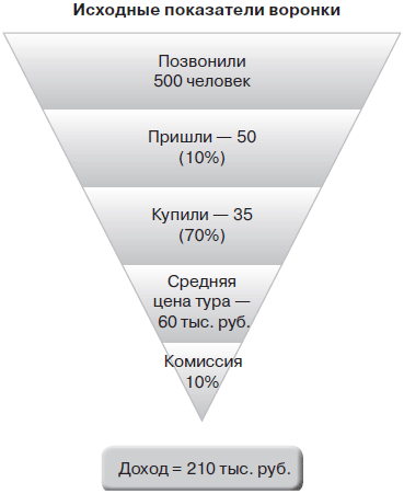 Рис. 5. Исходные показатели воронки Итак, допустим, что в ваш офис в месяц звонит 500 человек. Это не маленькая цифра, но и отнюдь не большая. Из них приходят к вам в офис на встречу с менеджером 50 человек, т. е. 10 % – это тоже стандартная цифра, мы берем ее из практики в сети «1001 Тур». Из них покупает 70 %, потому что тот, кто пришел, скорее всего, купит. Вероятность продажи гораздо выше, чем при телефонном звонке. С этим сложно не согласиться, это подтверждают все руководители турагентств: когда вы находитесь в личном контакте с человеком, когда он добрался до вас, очень высока вероятность того, что он купит. И конечно, люди будут уходить: либо не сошлись в цене, либо тур, за которым ехал клиент, уже продан, либо по каким-то другим причинам. Но тем не менее процент конверсии в продажи на этом этапе, т. е. с закрытием сделки, достаточно большой. И из 50 будет покупать 35. Давайте посмотрим среднюю цену тура. Среднюю цену тура мы берем 60 тыс. руб. за двоих. Следующий элемент воронки – это размер комиссии, получаемой от туроператора. Опять же возьмем его достаточно стандартным – 10 %. Это показатели, которые формируют ваш бизнес, потому что, если мы смотрим, что будет в итоге, мы количество купивших человек умножаем на среднюю цену тура, на процент комиссии, получаем 210 тыс. руб. в месяц. Это – наш доход, деньги, которые мы уже можем тратить на аренду, зарплату, это – доходы владельца бизнеса и т. д. Мы привели базовые цифры воронки продаж для некоторого усредненного туристического агентства. Конкретные цифры не столь принципиальны, мы хотим лишь показать, как вы можете, используя эту воронку, управлять доходностью вашего агентства. Теперь посмотрим, как вы можете работать с каждым из показателей и что произойдет в итоге. Не будем строить воздушных замков, не будем надевать розовые очки и думать, что мы увеличим все в 10 раз. Подкрутим каждый из показателей совсем немного. Например, вполне можно добиться увеличения количества звонков на 10 %. Вы это можете сделать за счет работы над собственным сайтом, за счет добавления отзывов на сайт, за счет увеличения бюджета на рекламу, за счет правильной настройки рекламы, за счет интернет-маркетинга. Об этом мы подробнее рассказываем в нашем видеокурсе «Как привлечь клиентов из Интернета в ваше туристическое агентство». Это решаемая задача. Согласитесь, 10 % – это не такой большой прирост. Затем добьемся хотя бы 3 %-ного прироста к увеличению пришедших в офис, т. е. было 10 %, стало 13 %. Это тоже можно сделать, например внедряя скрипты телефонных разговоров, чтобы менеджеры при каждом звонке не просто рассказывали о том, куда стоит поехать, что сколько стоит, и 30 минут рассказывали о прелестях различных курортов, а убеждали клиентов приехать в офис. Соответственно вполне реально поднять количество пришедших людей до 13 %. Опять же мы можем с 70 до 80 % увеличить количество купивших в офисе – это те же скрипты, но используемые при личном контакте. Это работа с возражениями клиента – необходимо, чтобы были четкие алгоритмы, что делать, когда клиент говорит: «Я подумаю» или «Дорого». Это управление специальными акциями, расширение ассортимента (чтобы в офисе менеджер мог удовлетворить любой запрос клиента по направлению и виду отдыха). В общем, это навыки менеджеров в первую очередь, и какие-то горящие предложения. Теперь поработаем над ср