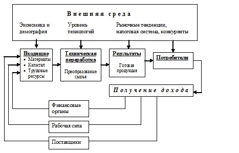 Рисунок 3. Основные потоки в организации Организация как система координации поведения людей обеспечивает процесс достижения целей. Деятельность участников организации реализуется в рамках структуры и зависит от эффективности установленных связей между ними. Для того чтобы организация эффективно выполняла свои функции по достижению целей, используют мотивацию, стимулирование, власть, лидерство, управление конфликтами, организационную культуру и др. Все организации вне зависимости от целей, типа и конечного результата имеют общие для всех сложных организаций характеристики. 1. Ресурсы. Основные ресурсы, используемые организацией, это люди (человеческие ресурсы), капитал, материалы, технология и информация. Цели всякой организации (производственной или обслу-живающей) включают преобразование ресурсов. 2. Зависимость от внешней среды. Одной из самых значимых ха-рактеристик организации является ее взаимосвязь с внешней средой. Ни одна организация не может быть закрытой системой. Организация зависит от внешней среды как в отношении своих ресурсов, так и потребителей, пользователей результатами ее труда. Внешняя среда включает все силы и институты, с которыми организация сталкивается в своей оперативной или стратегической деятельности: экономические условия, законодательство, систему ценностей в обществе, уровень технологий, конкурентов. Внешняя среда никогда не бывает стабильна, поэтому мало знать свою " среду обитания" и природу ее изменений, надо уметь реагировать на эти изменения. Внешние факторы оказывают влияние на все, что происходит внутри организации. 3. Горизонтальное разделение труда. Очевидной характеристикой для любой организации является разделение труда. Разделение всей работы на составляющие компоненты обычно называется горизонтальным разделением труда. Горизонтальное разделение направлено на дифференциацию функций. Классический пример горизонтального разделения труда на предприятии: производство, маркетинг, финансы, контроль. 4. Подразделения. Любая сложная организация состоит из подразделений, которые выполняют конкретные задания и добиваются конкретных специфических целей. Такие подразделения часто называются отделами или службами. Как и целая организация, частью которой они являются, подразделения представляют собой группы людей, деятельность которых сознательно координируется для достижения общей цели. 5. Вертикальное разделение труда. Работа организации связана с иерархией управления, она разделяется на составляющие части (кто-то должен координировать работу, чтобы она была успешной). Вертикальное разделение отделяет координацию как самостоятельную функцию. Деятельность по координированию работы других людей и составляет сущность управления организацией. 6. Необходимость управления. Цель организации рассматривается как ориентир для направлений потоков связей, полномочий и ответственности. Для того чтобы организация могла добиться реализации своих целей, задачи должны быть скоординированы посредством вертикального разделения, иерархии полномочий и ответственности. Поэтому управление является существенно важной деятельностью для любой организации. Организация любой компании связана с большим количеством разнообразных видов работ. Для нормальной работы любая компан