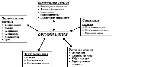Рисунок 4. Внешняя среда организации Для организации деловая среда выступает как надсистема, а макроокружение как над-надсистема. От того, в каком состоянии находятся надсистемы, зависит развитие искомой системы - организации. Деловая среда. К деловой среде относится все, что, находясь за пределами организации, взаимодействует с ней и оказывает на нее непосредственное влияние в целом или на отдельные ее подразделения. Как правило, в деловую среду организации входят: потребители продукции и услуг; поставщики материальных и природных ресурсов; конкуренты; инфраструктура; государственные и муниципальные организации; международный сектор. Деловая среда формируется в процессе развития организации, границы деловой среды определить сложно. Организация может изменить цели, стратегию, сферу деятельности, продукцию или услуги - все это соответственно изменит и границы ее деловой среды. Приведем краткую характеристику основных элементов деловой среды. Потребители - это непосредственные покупатели и клиенты компании. Состав потребителей зависит от сферы деятельности, от типа товара и услуг, от масштаба производства, от занятости рынка и многих других факторов. Кроме непосредственных покупателей и клиентов, на деятельность организации оказывают значительное влияние и общественные организации (общество потребителей, общество эко-логической защиты и др.). Поставщики материалов, сырья, полуфабрикатов, электроэнергии, воды, газа создают ресурсную зависимость. Зависимость организаций от поставщиков - одна из сильных. Отношения с поставщиками значительно отражаются на себестоимости, качестве продукции, сроках изготовления, тем самым оказывая непосредственное влияние на эффективность. Поставщики-монополисты могут завышать тарифы, цены, отключить энергию, газ, ставя организации в кризисное положение, на грань банкротства. При заключении отношений на поставки необходимо обратить внимание на цены, качество, соблюдение сроков поставок, возможность замены поставщика, необходимо выяснить, является ли он монополистом. Конкурентами, как правило, являются те организации, которые реализуют схожую продукцию на одних и тех же рынках, одним и тем же потребителям. Грамотная конкурентная стратегия требует анализа: - конкуренции между существующими компаниями; Инфраструктура - это совокупность отраслей и видов деятельности, обслуживающих организацию и создающих для нее как бы общий фундамент, опору. Это та часть деловой среды, которая обеспечивает организацию финансовыми, трудовыми ресурсами, транспортным обслуживанием, консультационными, аудиторскими, страховыми и др. услугами. В эту часть деловой среды входят банки, фондовые биржи консультационные, аудиторские, лизинговые компании, склады, железная дорога и пр., с которыми организация устанавливает связи. Финансовые организации - фондовые биржи, частные инвесторы. Надежность финансовых организаций - необходимое условие для стабильной работы. Участившиеся кризисы - банкротство банков, резкие колебания валютного курса - все это усиливает степень неопределенности и создает большие сложности для менеджеров компании. Поэтому так важен тщательный выбор финансовых учреждений. Рынок рабочей силы: кадровые агентства занятости, учебные за-ведения, биржи труда. Изучение рынка рабочей силы