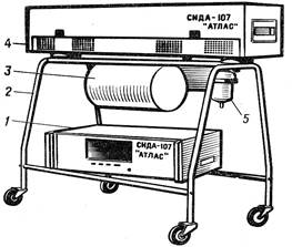 стробоскопического эффекта. При этом метка на шкиве будет казаться неподвижной. Для проверки давления и герметичности топливопроводящей системы низкого давления используется приспособление (рисунок 2.3), которое присоединяется параллельно топливоподкачивающему насосу или топливным фильтрам и при работающем двигателе определяет герметичность соединений и работоспособность приборов по перепаду давлений. Дымомер НС 112 " МОТОРПАЛ" (Чехия) (рисунок 2.5) — переносной прибор, позволяет визуально определять дымность отработавших газов дизельных двигателей методом сравнения пробно-отпечатанных на бумажном фильтре продуктов горения, со шкалой — эталоном. Стенд СИДА-107 " АТЛАС" (рисунок 2.4)—электронно-оптический измеритель дымности дизельных автомобильных двигателей. Конструктивно дымомер состоит из первичного 4 и измерительного 1 преобразователей, соединенных между собой кабелем, блока пробоподготовки 3, шасси 2 и отстойника 5. Первичный преобразователь представляет собой оптический блок, помещенный в каркасе, и состоит из трех основных узлов осветителя, измерительной камеры и светоприемника. В измерительном преобразователе собрана электрическая схема прибора. Работа дымомера основана на турбодинамическом методе контроля аэрозолей, где высокочувствительные электрооптические элементы считывают количество продуктов горения (сажи) в единице объема отработавших газов и передают данные на электронно-регистрирующие устройства.