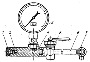 1 — винт прокачки; 2 — клапан; З — манометр; 4 — корпус; 5 — трехходовой кран; б — шланг; 7 — переходной штуцер