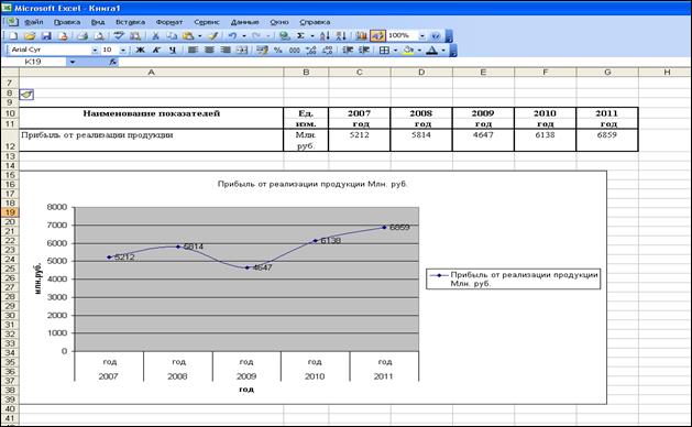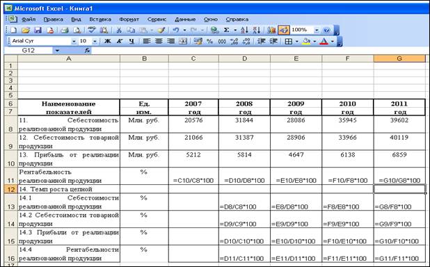 Пример выполнения задания 1 с использованием программы Microsoft Excel по варианту 11 На основе данных об основных результатах производственно-финансовой деятельности предприятия с использованием соответствующих компьютерных информационных технологий выполнить расчет показателя рентабельности реализованной продукции за период с 2007 по 2011 год и определить темпы его динамики. Построить график динамики рентабельности и сделать общий вывод. Таблица 1.3 – Исходные данные к выполнению задания 1 по варианту 11