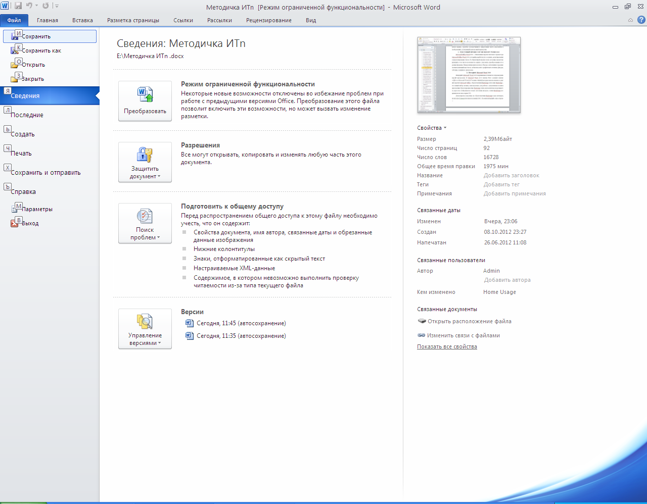 Кнопка Файл позволяет получить доступ к следующим командам по работе с документом: Создать, Открыть, Сохранить, Сохранить как, Печать, Подготовить, Отправить, Опубликовать, Закрыть. Для возврата к документу из «Представления Backstage» надо щелкнуть на вкладке Главная или нажать клавишу ESC.