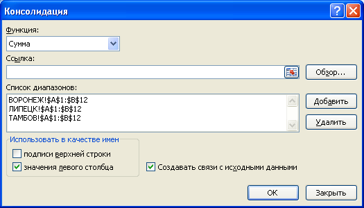 1. На каждом отдельном листе составьте таблицы с данными об объемах продаж в автосалоне «Колесо» в Липецке и его филиалах в Тамбове и Воронеже. Таблицы должны содержать поля: Марка автомобиля, Количество проданных автомобилей. Заполните таблицы произвольными записями. Количество записей для каждого филиала должно быть равным и не менее 10. Для добавления листов щелкните правой кнопкой мыши по ярлычкам листов и в контекстном меню выберите команды Вставить→ Лист. 2. Каждому добавленному листу присвойте соответствующее имя – Липецк, Тамбов, Воронеж, Консолидация. Для этого установите указатель мыши на ярлычке листа и щелкните правой кнопкой мыши. В появившемся контекстном меню выберите команду Переименовать. Введите новое имя листа и нажмите клавишу [Enter]. 3. 4.