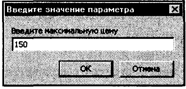 5. Сохраните запрос под именем Выбор книг. 6. Для запуска запроса на исполнение выполните команды Конструктор→ Выполнить. На экране появится диалоговое окно Введите значение параметра. Введите значение параметра для условия отбора и щелкните на кнопке ОК (рис. 39). 7. В зависимости от того, что реально содержится в таблице Книги в продаже, по результатам запроса будет сформирована результирующая таблица.