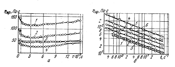 Рис. 30 – Зависимость эффективной вязкости плавленого сыра «Новый»: а – при температуре 70 0С – от длительности деформирования при скоростях деформаций: 1 – 0, 333 с-1; 2 – 1, 80; 3 – 5, 40; 4 – 16, 20 с-1; б – от скорости деформации при температурах: 1 – 95 0С; 2 – 90 0С; 3- 80 0С; 4- 70 0С; 5 – 60 0С; 6 – 50 0С. По реограммам определяли эффективную вязкость и вязкость при единичном значении скорости деформации плавленых сыров (рис. 30, б). С увеличением скорости деформации сдвига эффективная вязкость плавленых сыров уменьшается по степенному закону. При повышении температуры вязкость при единичном значении градиента скорости уменьшается по экспоненциальному закону Френкеля-Эйринга. Обобщенное уравнение для расчета эффективной вязкости расплавленной сырной массы имеет вид. Коэффициенты его приведены в табл. 37. Таблица 37