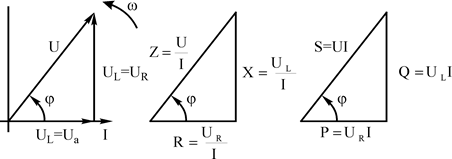 а) б) в) Рисунок 3.2 – Векторна діаграма ланцюга, трикутники опорів і потужностей З діаграми видно, що вектор загальної напруги за величиною дорівнює гіпотенузі прямокутного трикутника, катетами якого є вектори падінь напруги в активному і індуктивному опорах UR і UL а за напрямком U випереджає вектор струму I на кут j, причому 90° > j > 0, Проекція вектора напруги U на напрям вектора струму називається активною складовою вектора напруги і позначається Ua; для даної схеми Ua = UR. Проекція вектора напруги U на напрям, перпендикулярний вектору струму, називається реактивною складовою вектора напруги і позначається Up. для даної схеми Up = UL. Аналогічно діаграмі напруг, можна зобразити трикутник опорів (рис.3.2, б), одним з катетів якого є активний опір R=UR/I, другим - індуктивний опір XL = UL/I, а гіпотенузою - величина повного опору Z=U/I (як відношення діючої напруги до діючого струму ланцюга. З трикутника опорів виходить