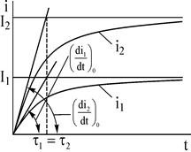 Дане диференційне рівняння характеризує закон зміни струму в котушці після замикання рубильника у схемі рис.3.8. Так, при підключення котушки індуктивності до джерела постійної напруги струм у ланцюзі збільшується, але не миттєво; відповідний графік перехідного струму приведено на рис. 3.9.